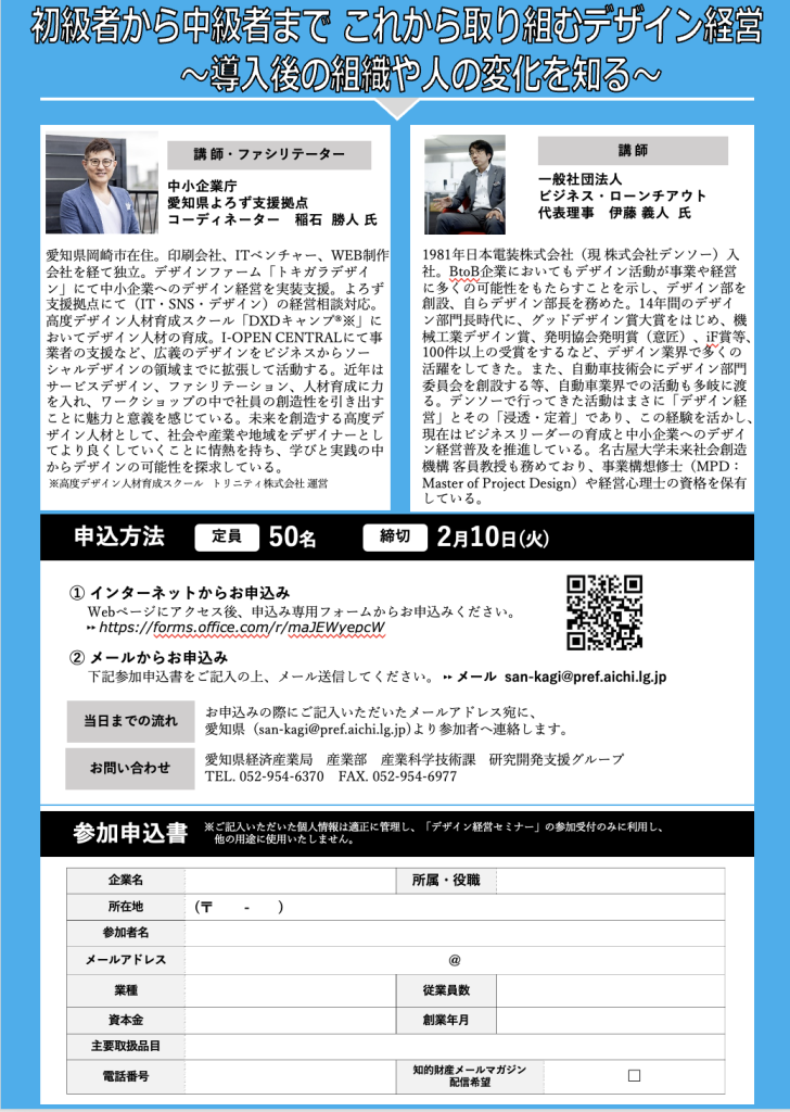 2月20日(金)に愛知県庁 産業科学技術課様とよろず支援拠点のコラボセミナー「デザイン経営セミナー(導入後の組織や人の変化を知る)」を開催いたします!!